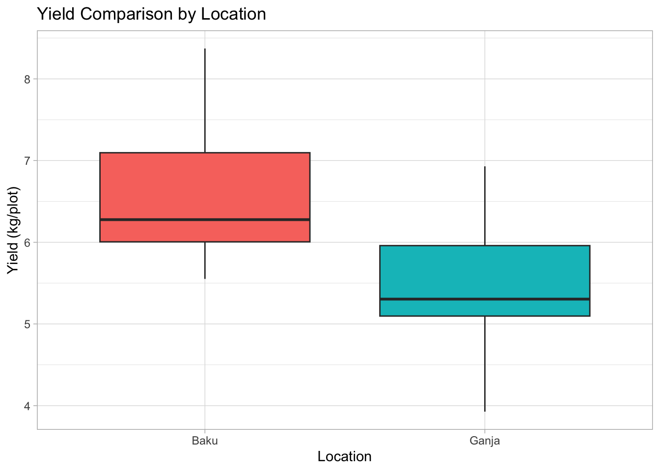 Are yields different in Baku vs. Ganja? Box plots are great for comparing distributions across groups.