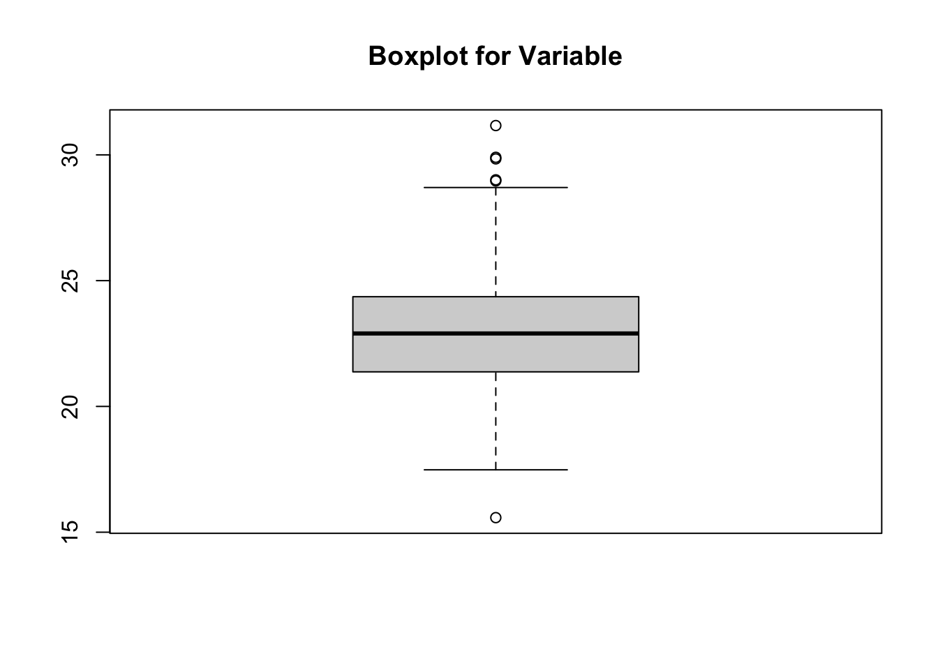 # We can use a simple boxplot to explore the overall structure of our data# and identify outliersareaBP <-boxplot(data$Area, main ="Boxplot for Variable")