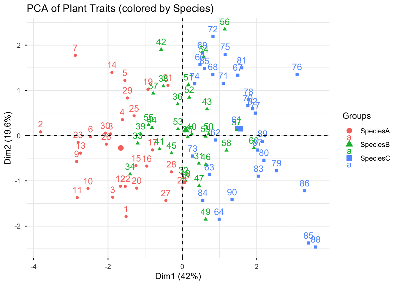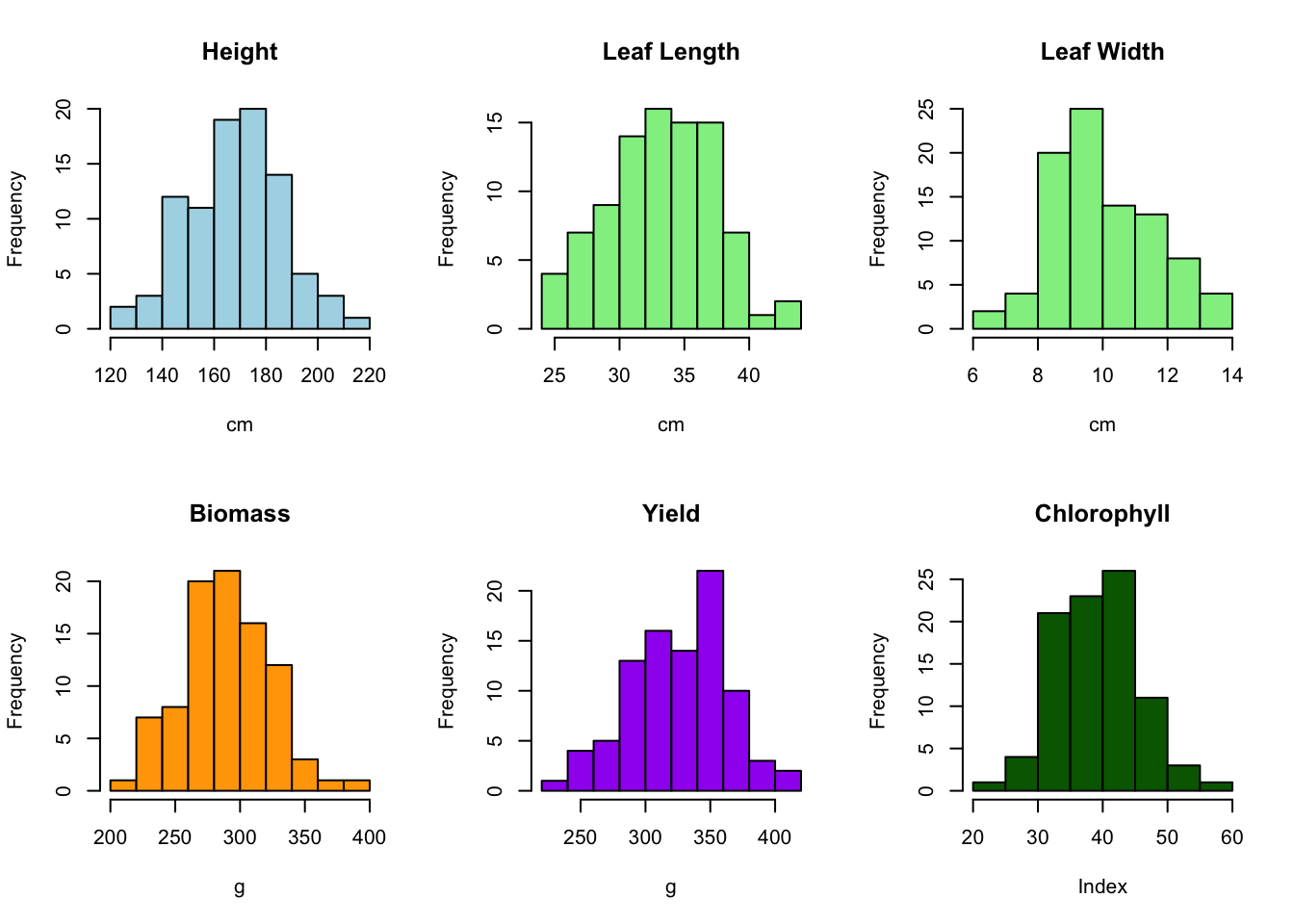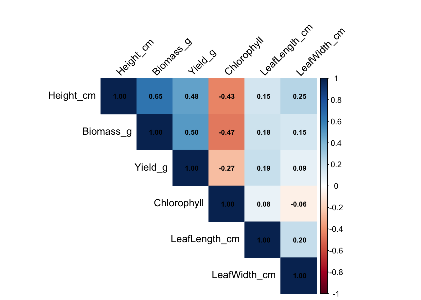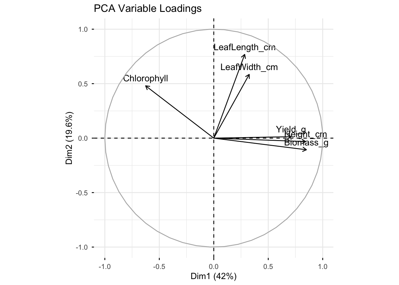 A PCA transforms many correlated variables (Height, Biomass, Yield, Chlorophyll, etc.) into a smaller set of uncorrelated components (PC1, PC2, …). Each component aims to capture as much variance as possible. It is a common technique used to visualize multi-variate data and identify correlated traits.