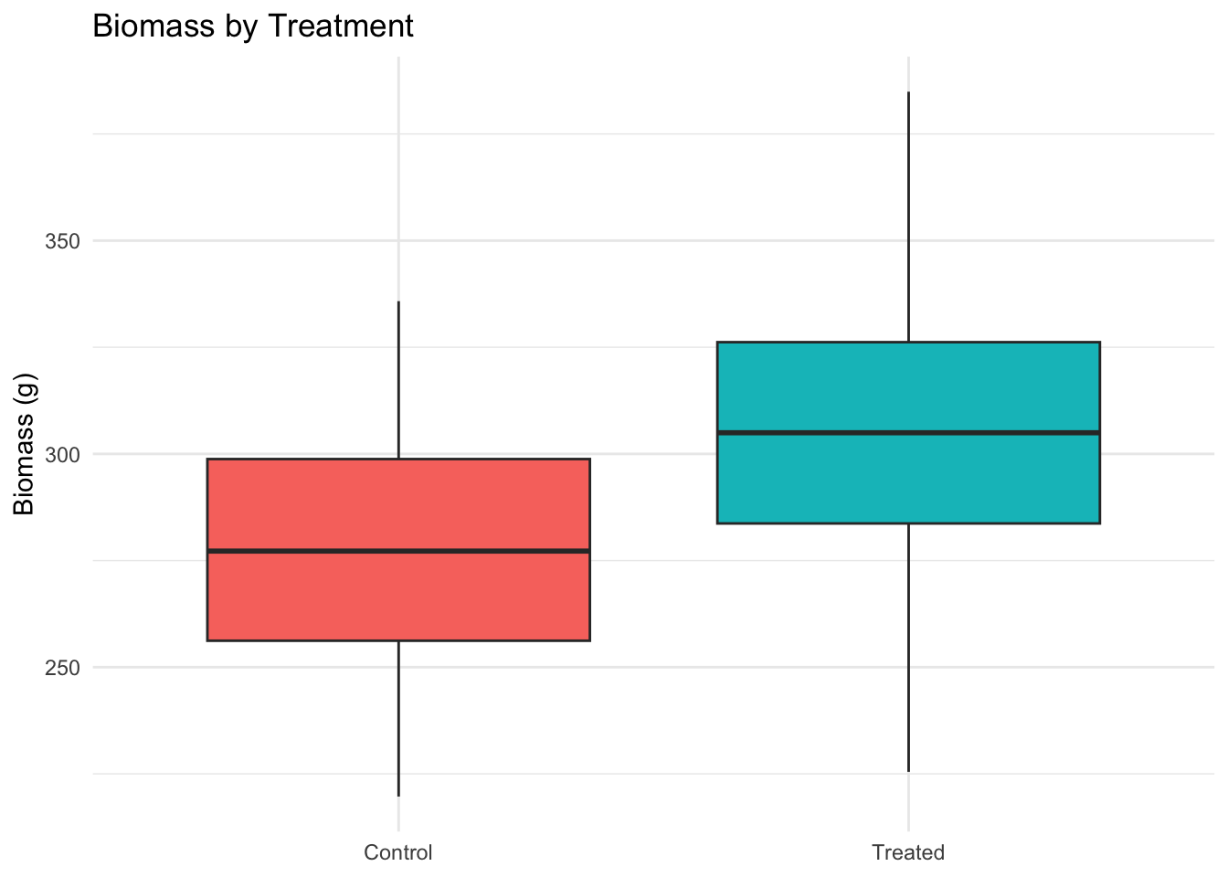 labs(title = "Biomass by Treatment", y = "Biomass (g)", x = NULL) +