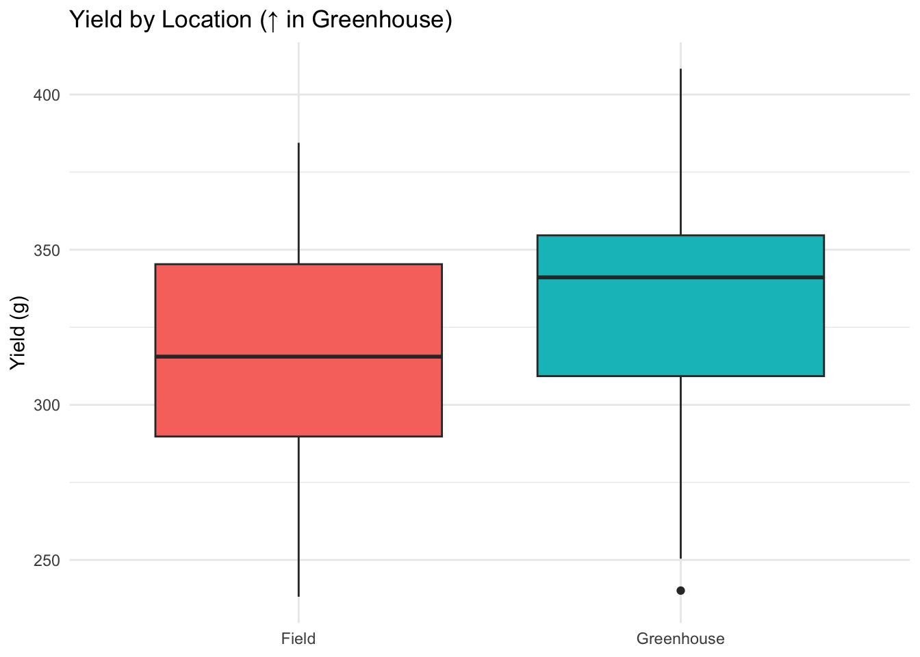 labs(title = "Yield by Location (↑ in Greenhouse)", y = "Yield (g)", x = NULL) +