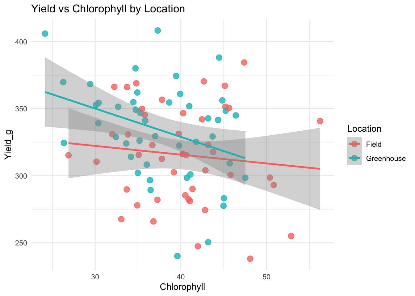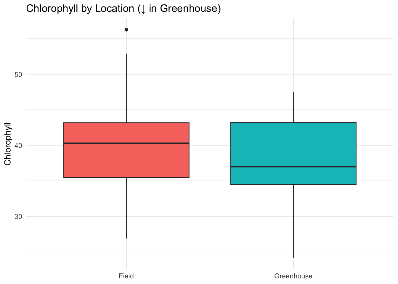 labs(title = "Chlorophyll by Location (↓ in Greenhouse)", y = "Chlorophyll", x = NULL) +
