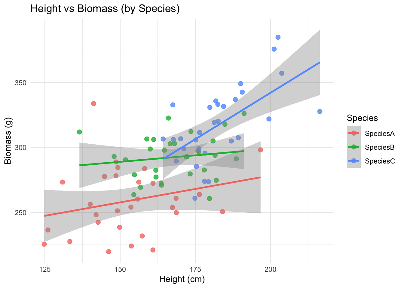ggplot(data, aes(Height_cm, Biomass_g, color = Species)) +