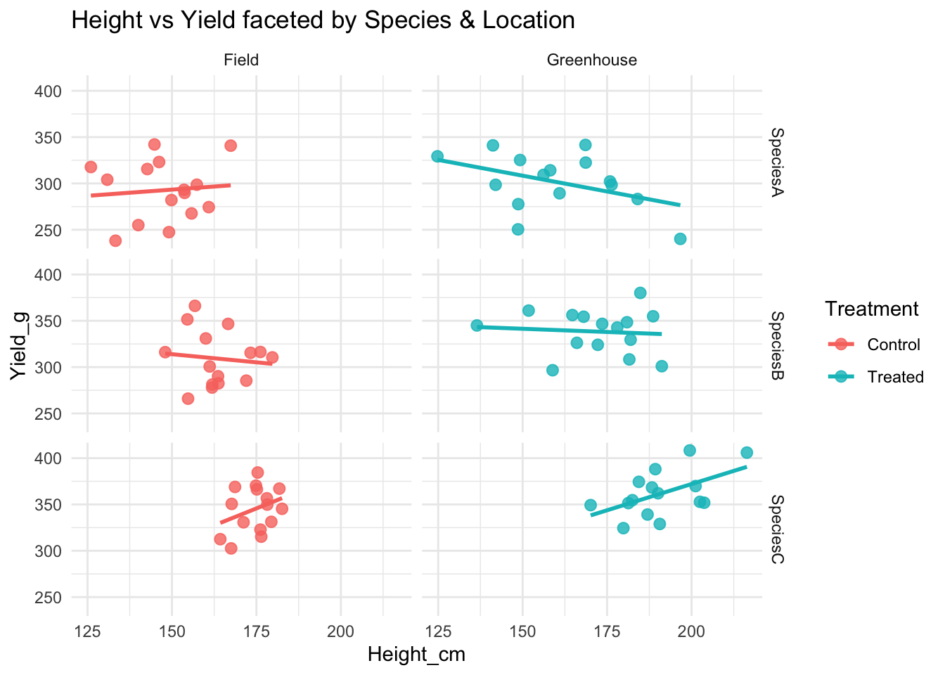 labs(title = "Height vs Yield faceted by Species & Location") +