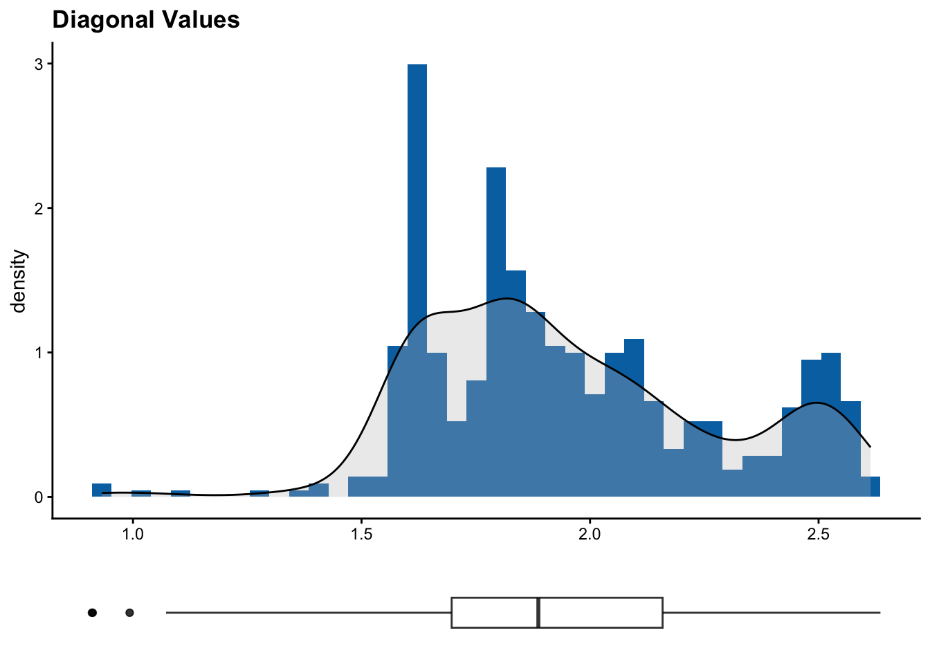 The diagonal of a kinship matrix is the self-relatedness of each individual. Most kinship estimators normalize values such that they are close to 1 or 0.5 according to scaling. Deviations may represent uneven SNP quality, duplicates or inbreeding. Off-diagonal entries are pairwise kinship estimates between two different individuals. These values are often closer to 0 , meaning the individuals are unrelated. Positive values mean the individuals share more alleles than expected by chance, and negative values mean the individuals are less related than expected. Clusters in a heatmap or in off-diagonal values often represent subpopulations.