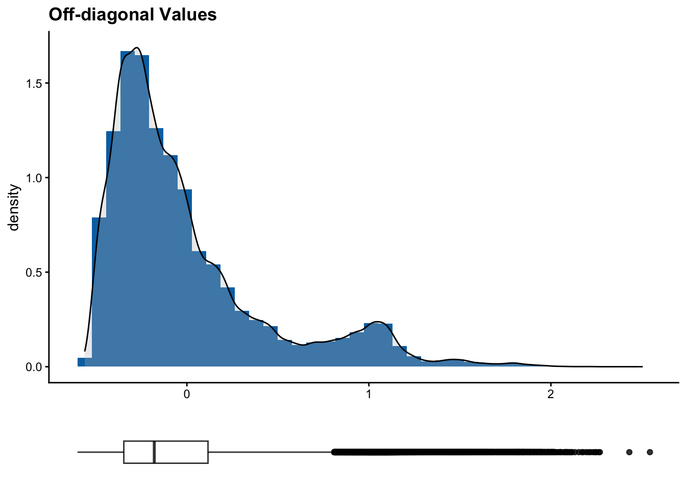 function from our package, which returns a list object with our kinship matrix, a data frame with our potential duplicates, and plots of the distribution of diagonal and off-diagonal values from our kinship matrix.