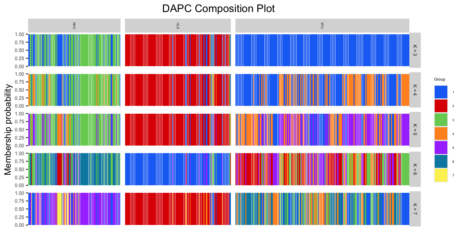 Our resulting DAPC outputs group assignments for each individual, which can be visualized through a composition plot.