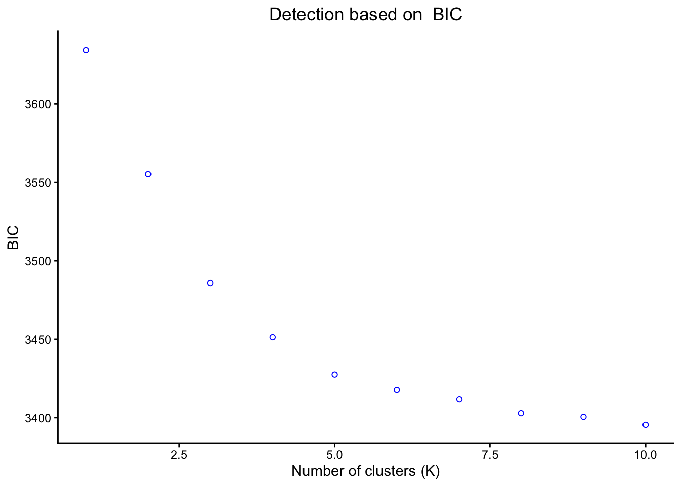 <- kMeansStats(matrix, pca$pca, 10, "BIC")