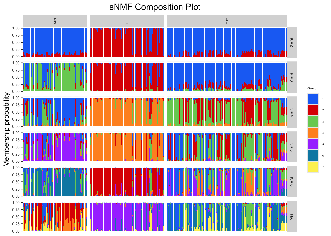sNMFCompoPlot(sNMF$qmatrix, matrix, krange = 2:6, subgroups = popSet)