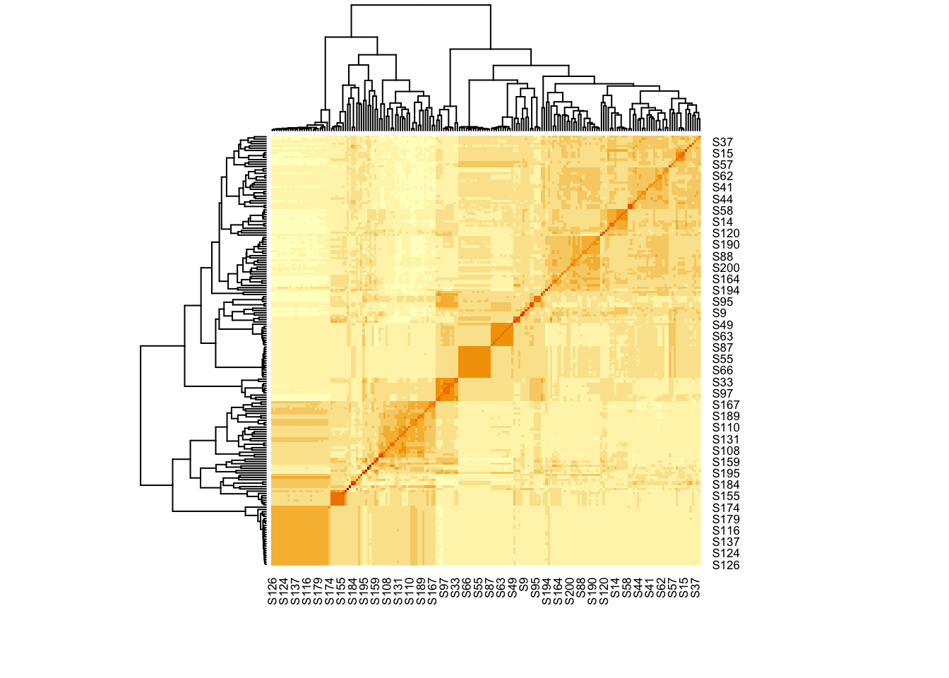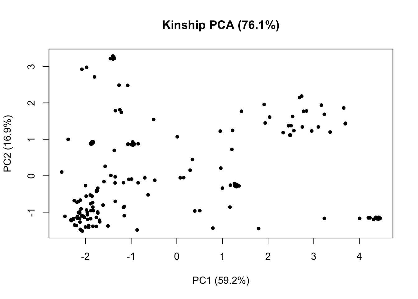 A kinship matrix was produced and used in the GWAS analysis. The method for producing this matrix can be defined by thge kinshipMethod parameter in the runSingleTraitGwas() function. By default, the same kinship matrix is used for testing all SNPs (GLSMethod = “single”). When GLSMethod = “multi”, the kinship matrix is chromosome-specific. As shown by Rincent et al.(2014), this often gives a considerable improvement in power.