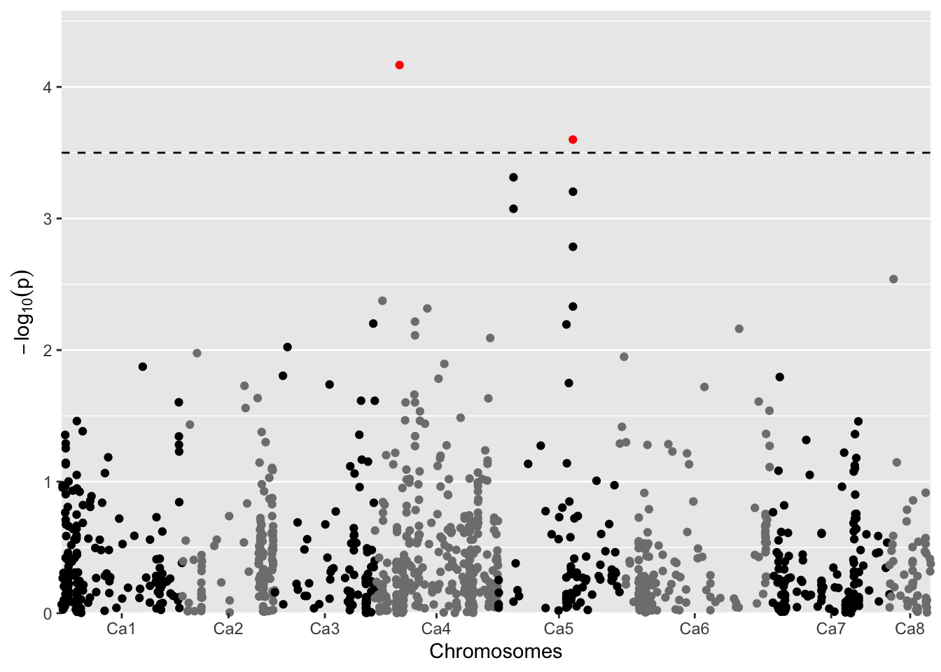 Prior to running our analysis, we need to compute a threshold by which to identify significant SNPs. The threshold for selecting significant SNPs in a GWAS analysis tends to be computed by using Bonferroni correction, with an alpha of 0.05. The alpha can be modified by setting the option alpha when calling the runSingleTraitGwas() function. Two other threshold types can be used: a fixed threshold (we set the thrType parameter to “fixed”) by specifying the log10(p) (LODThr) value of the threshold, or a small threshold (we set the thrType parameter to “small” and nSnpLOD to n) which defines the n SNPs with the highest log10(p) scores as significant SNPs.