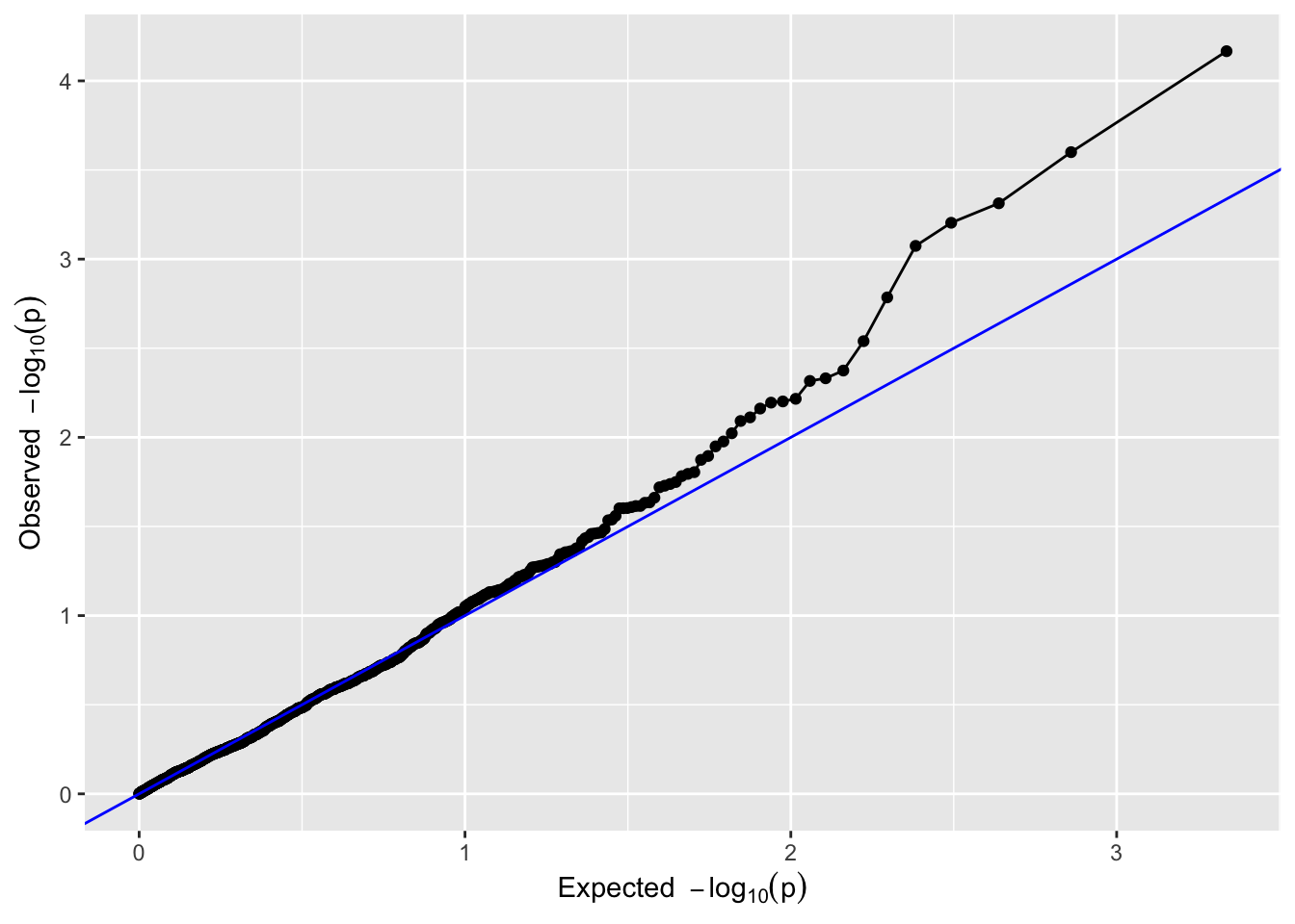 A QQ-plot of the observed against the expected log10(p) values. Most of the SNPs are expected to have no effect, resulting in P-values uniformly distributed on [0,1], and leading to the identity function (y=x) on the log10(p) scale. Deviations from this line should only occur on the right side of the plot, for a small number of SNPs with an effect on the phenotype (and possibly SNPs in LD).