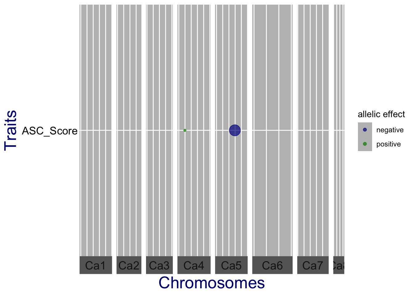 A qtl plot of GWAS. The significant SNPs are marked by circles at their genomic positions, with diameter proportional to the estimated effect size. Colors indicate the direction of the effect: green when the allele increases the trait value, and blue when it decreases the value.