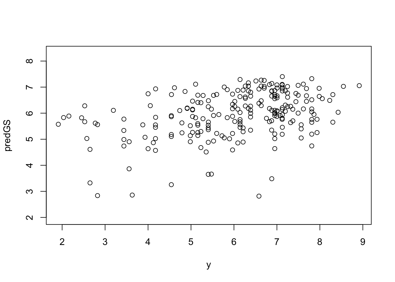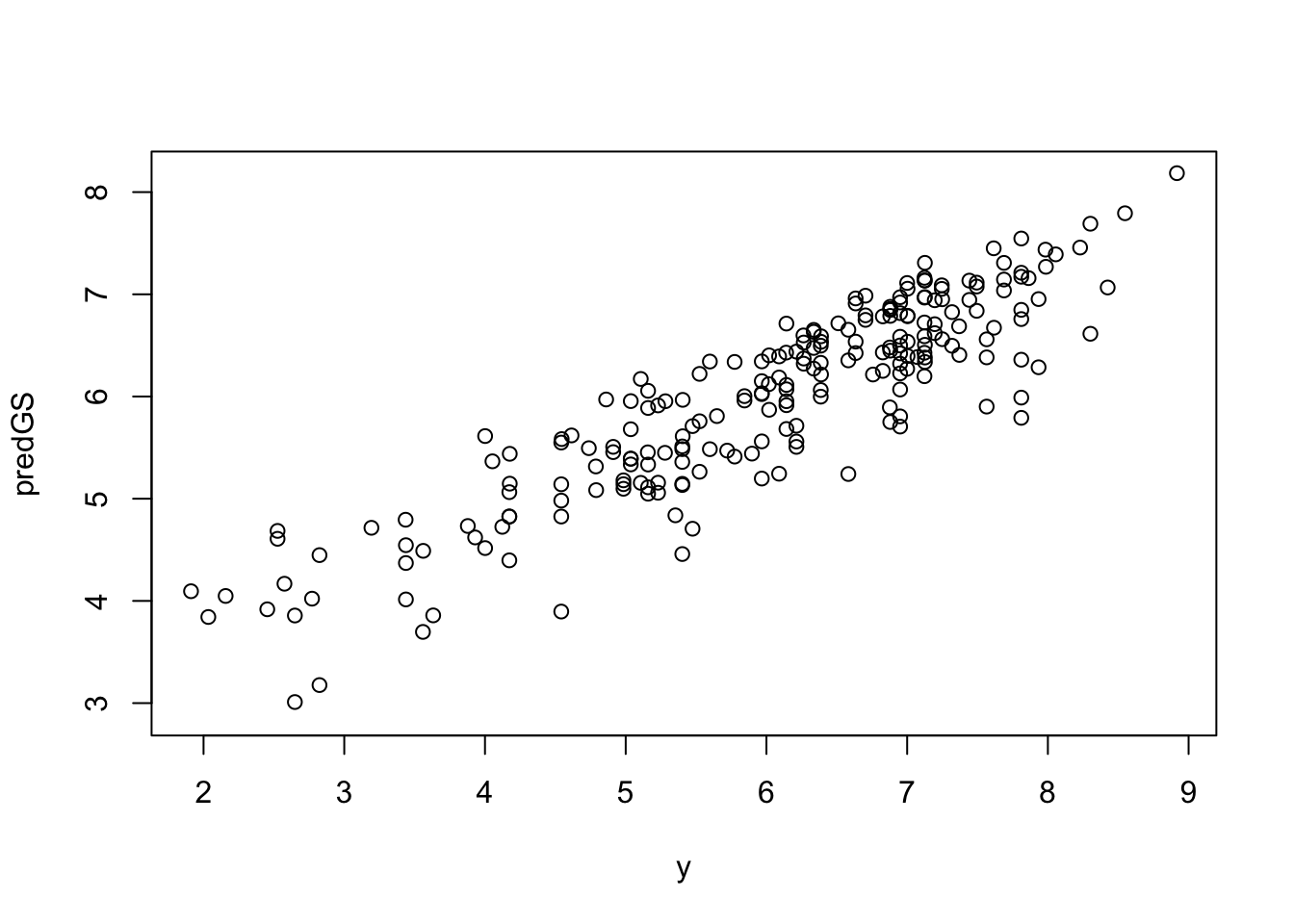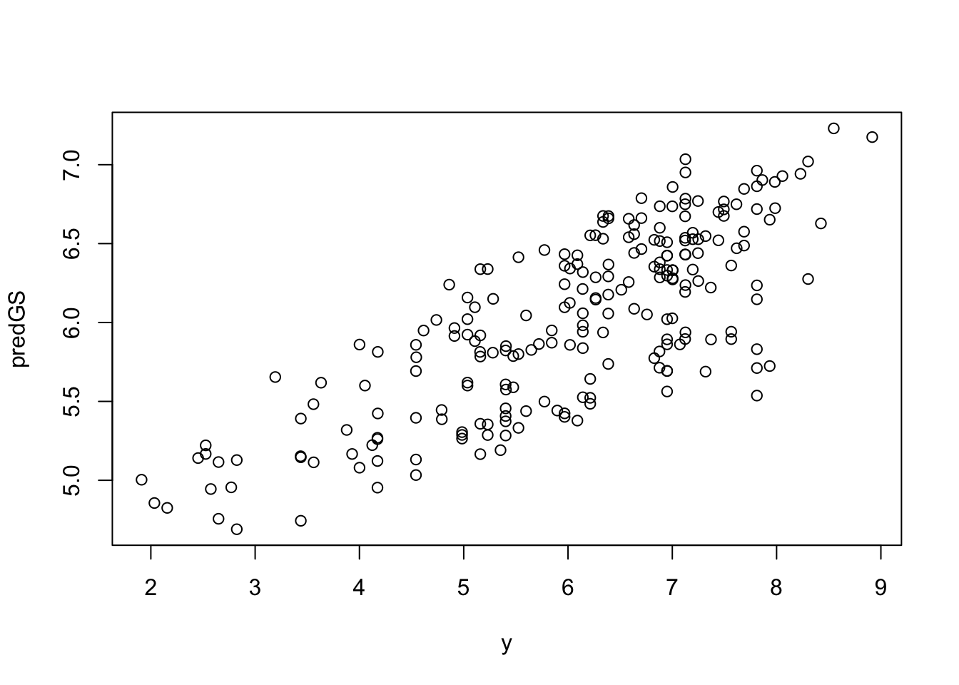 # predGS_cv <- matrix(data = GS$beta, nrow = length(y), ncol = 1) + M %*% GS$u